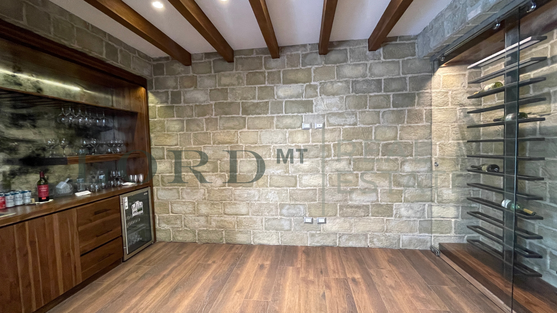 Bar con piedra empotrada, lavatrastos y cava de vinos